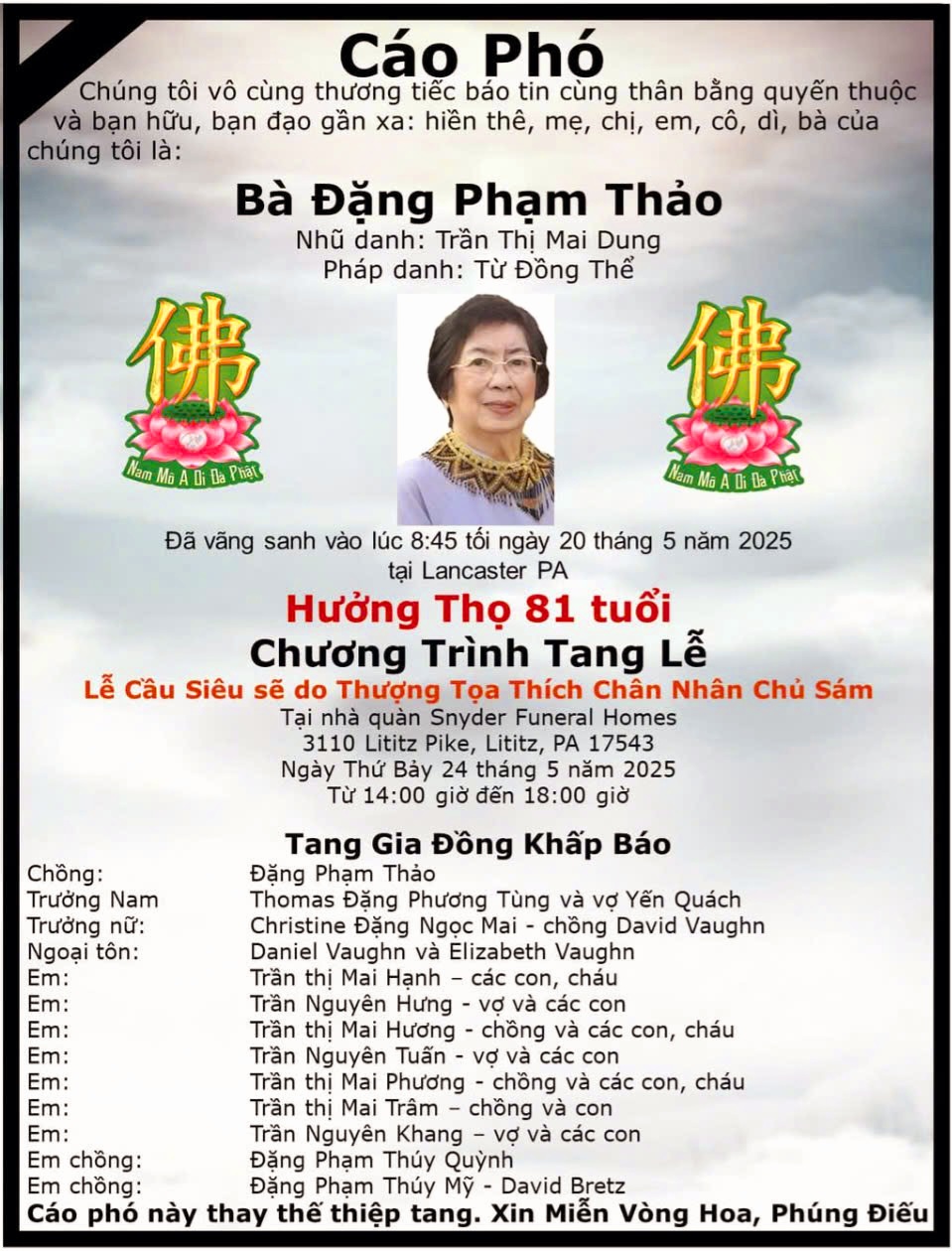 ĐẶNG PHẠM THẢO ( Nhủ Danh Trần Thị Mai Dung ) September 27, 1945 - May 20, 2025