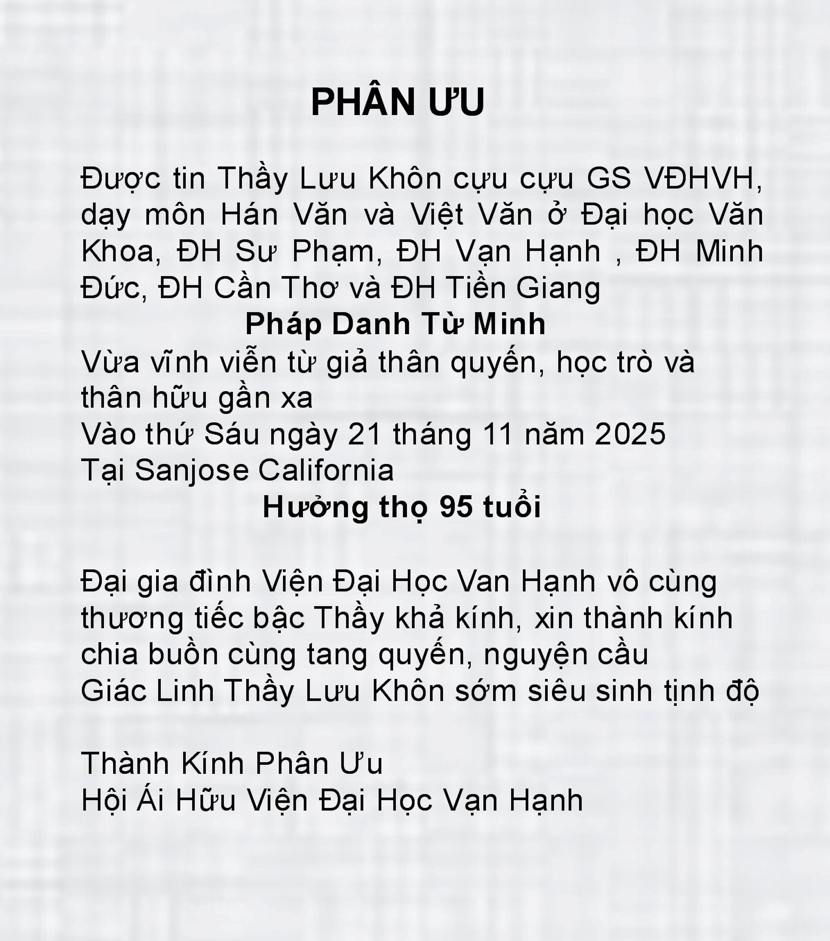 LƯU KHÔN February 14, 1930 - November 21, 2025