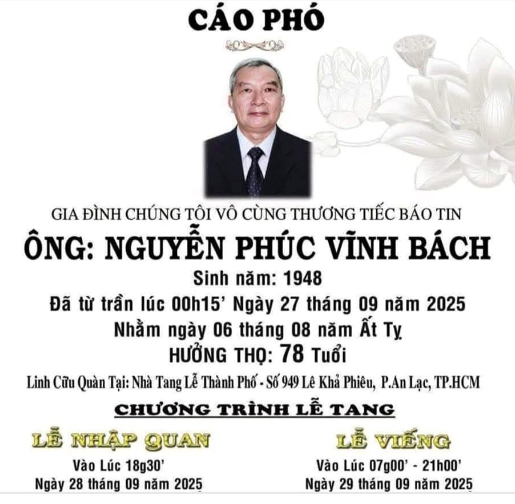 Bạn Vĩnh Bách, cựu nhân viên Viện Đại Học Vạn Hạnh, cựu sinh viên PK KHXH, khóa 1, đã từ trần ngày 27 tháng 9. 2025