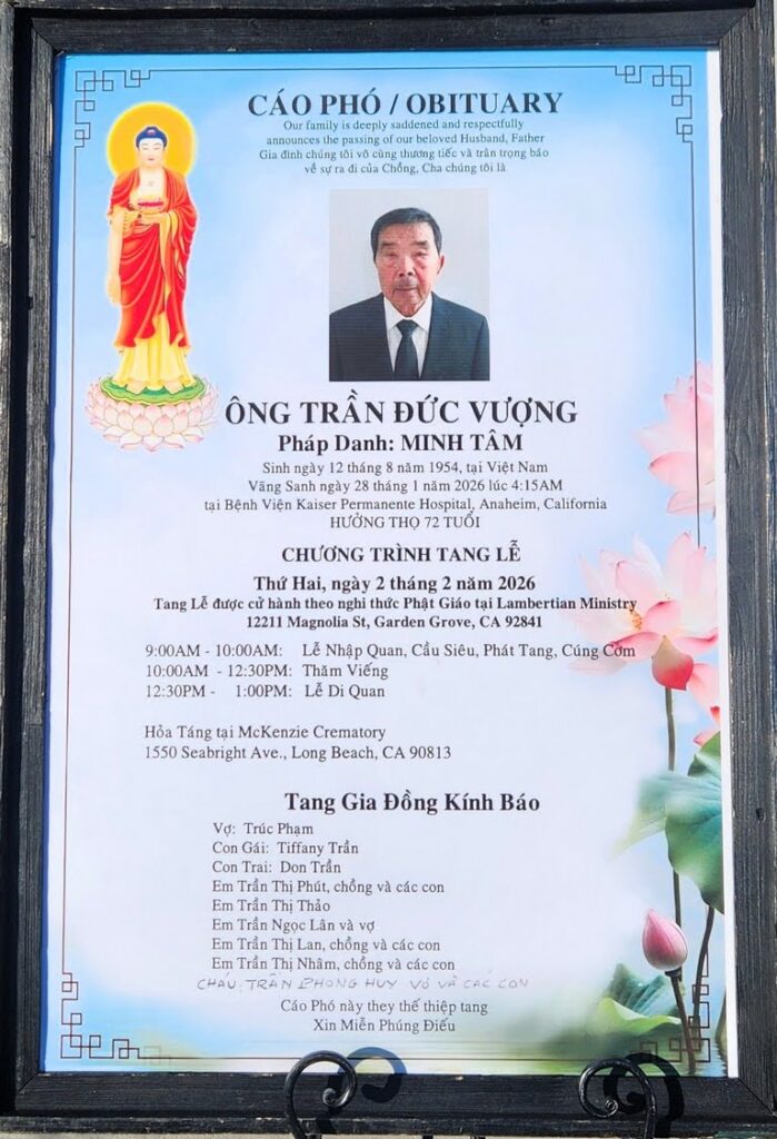 Tang lễ sẽ cử hành tại Kambertian Ministry 12211 Magnolia st, Garden Grove, CA 92841 , vào sáng thứ hai 2 tháng 2 năm 2026 .