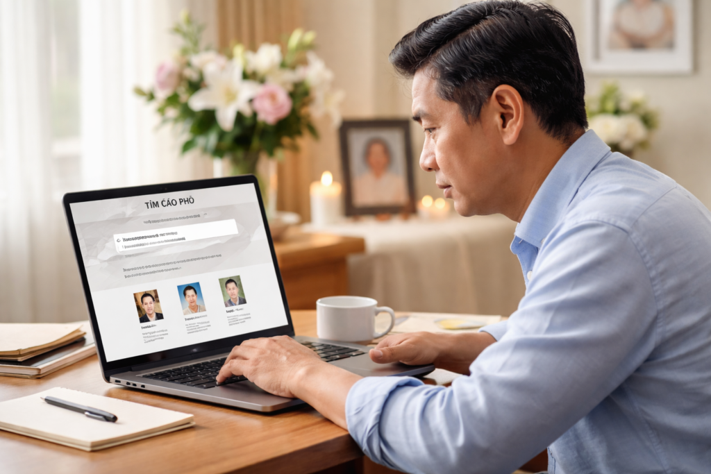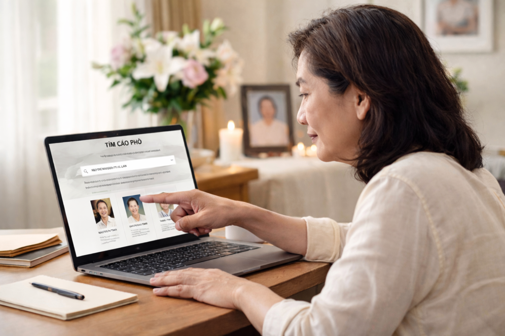 Nhập thông tin của người đã khuất vào ô tìm kiếm để xem cáo phó và các chi tiết liên quan. Xin lưu ý có thể có nhiều người trùng tên, vì vậy quý vị nên xem thêm hình ảnh, ngày sinh, hoặc ngày mất để chọn đúng người mình đang tìm.